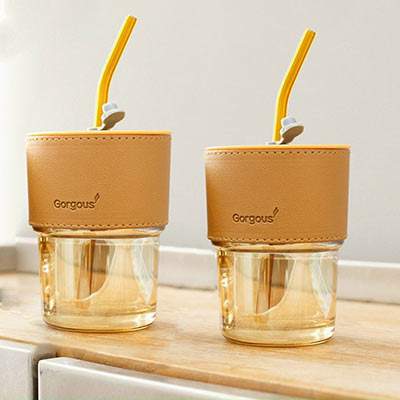 Ly cốc thủy tinh phối da đẹp, giá cạnh tranh, có ống hút, làm quà tặng khuyến mãi, quảng cáo